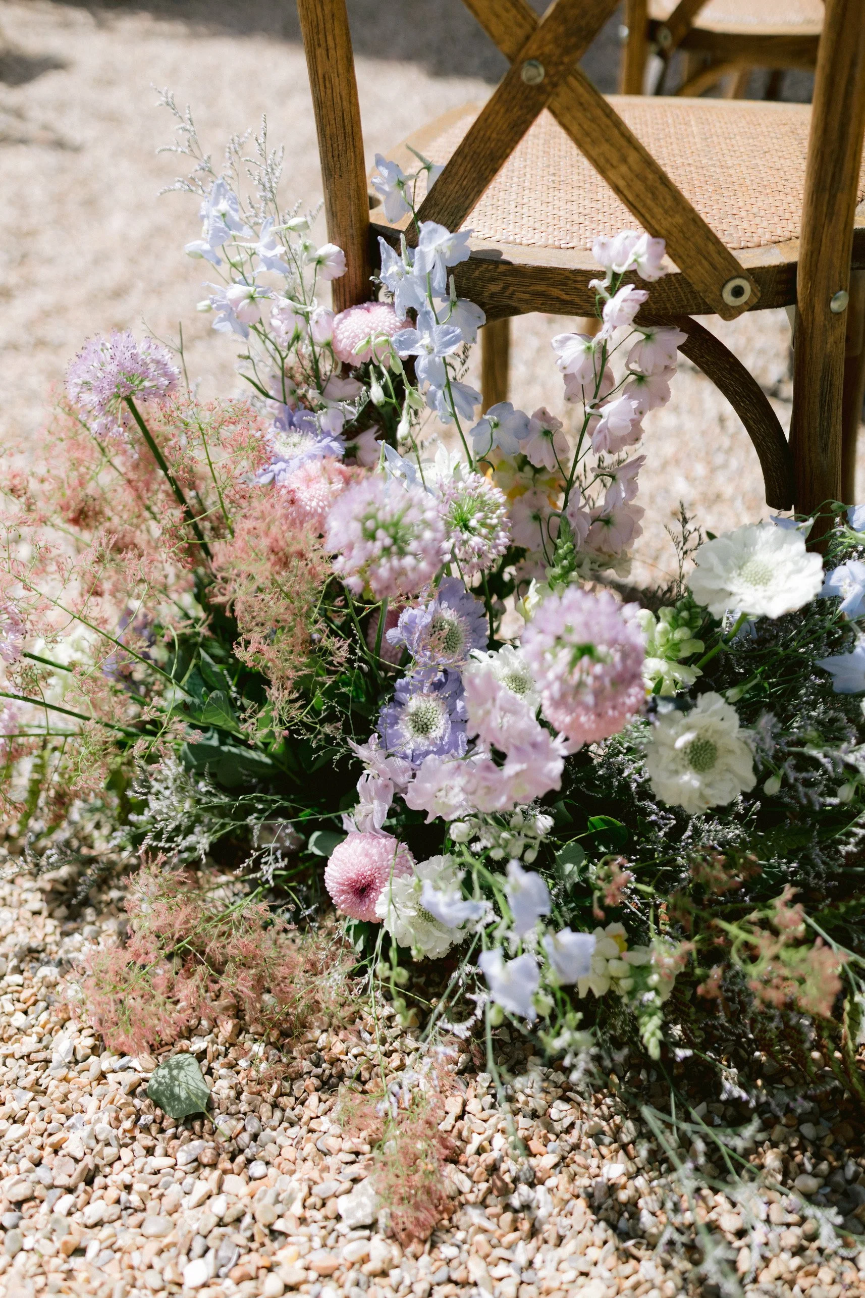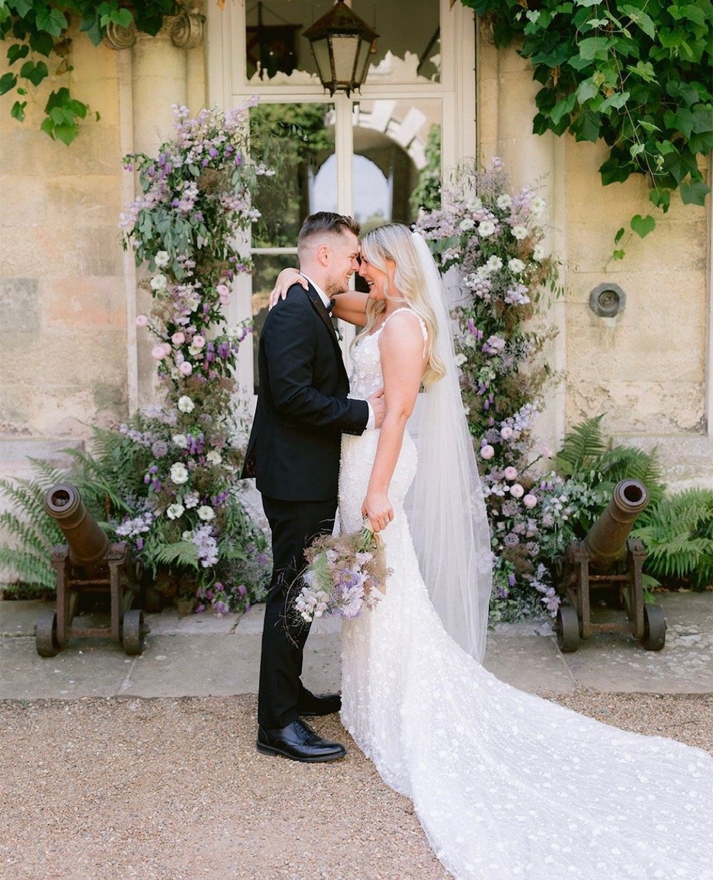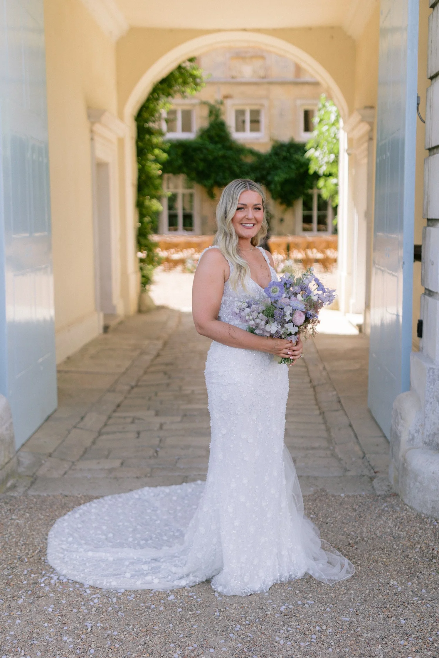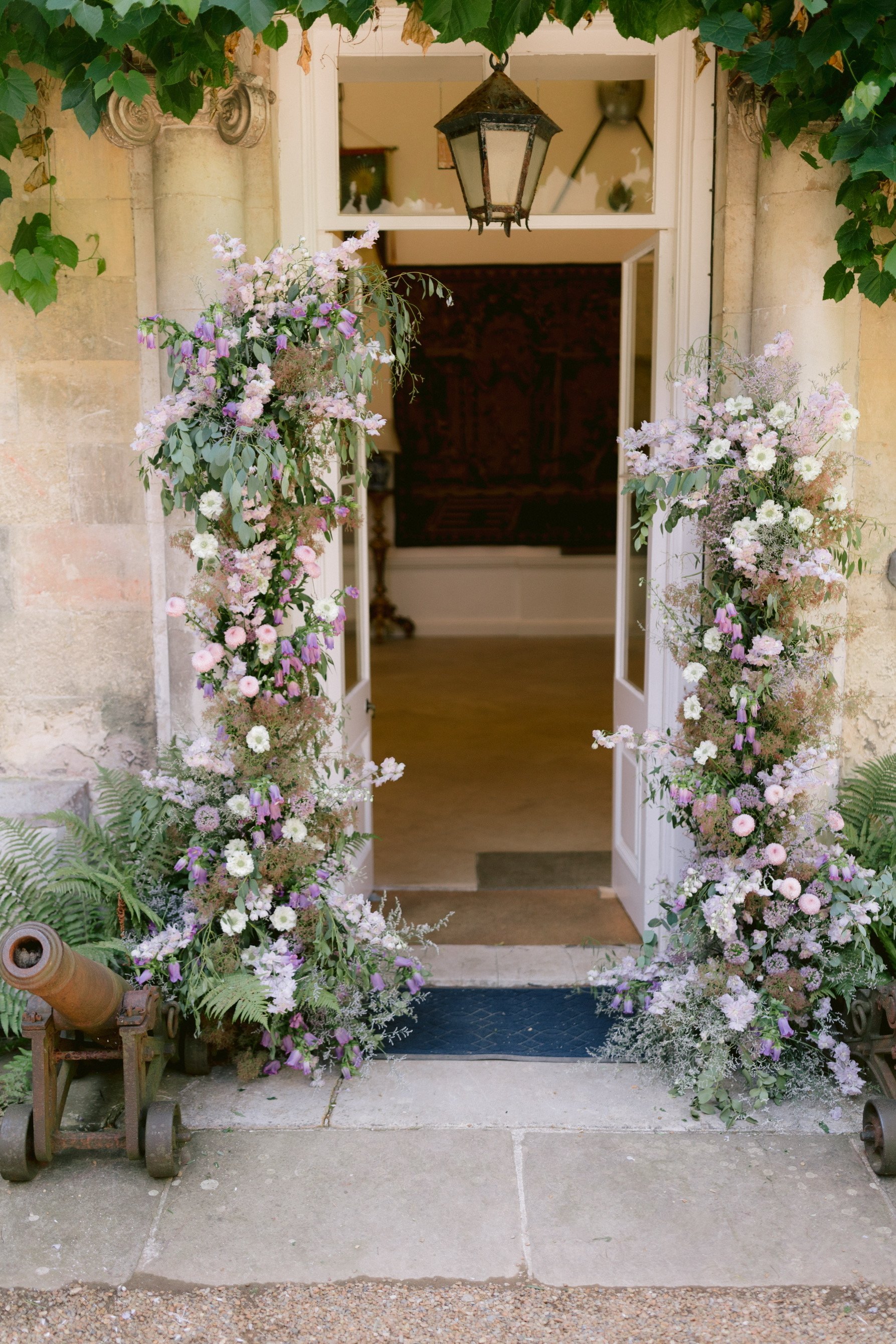 A beautiful August wedding at Firle Place with the most soft and luxurious combination of English florals in shades of lilac, from delphiniums and sweet peas to wildflowers and campanulas. A dramatic arch and floral meadows adorned the courtyard for the ceremony, with bud vases of blooms for the reception. Photography: Ross Hurley
