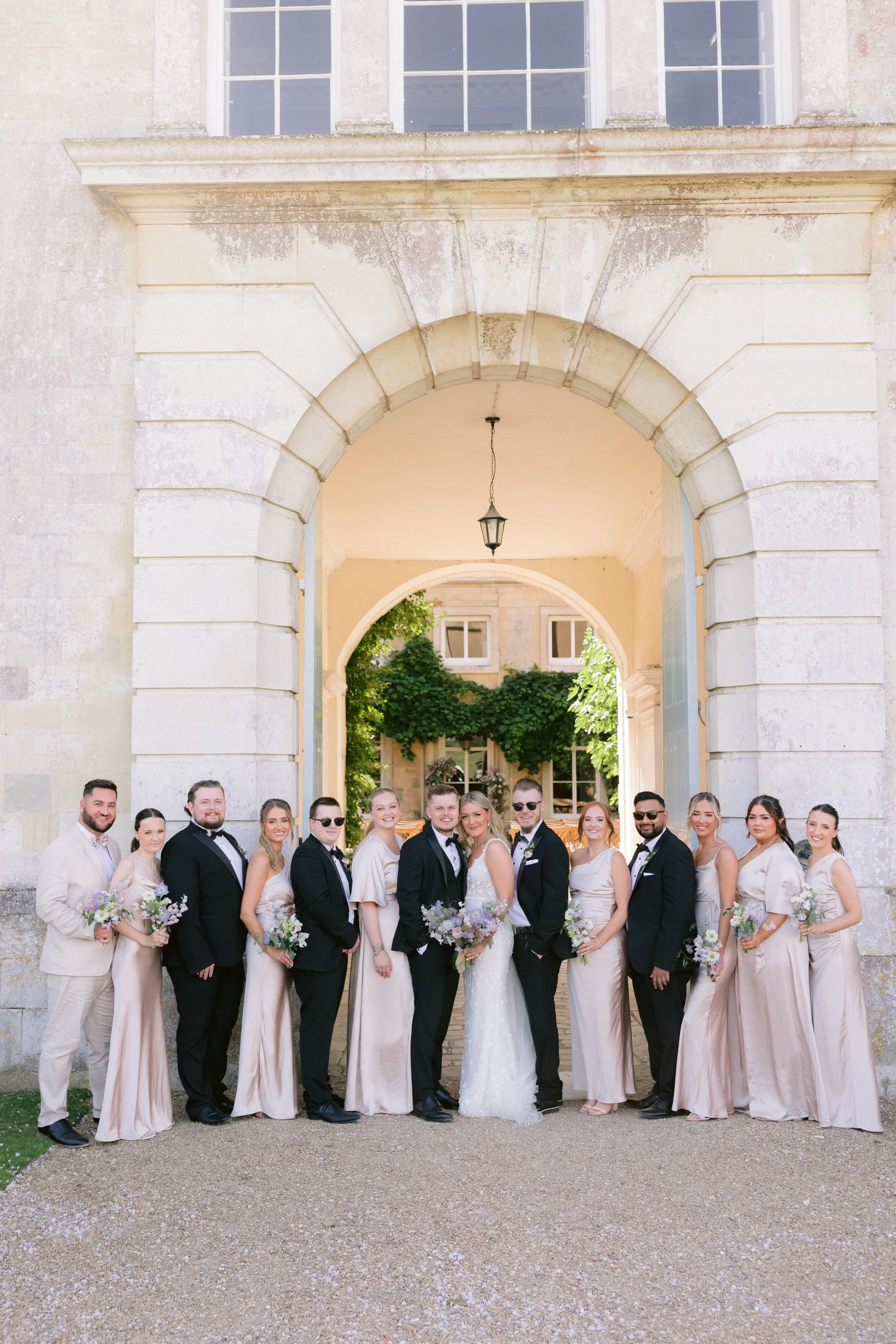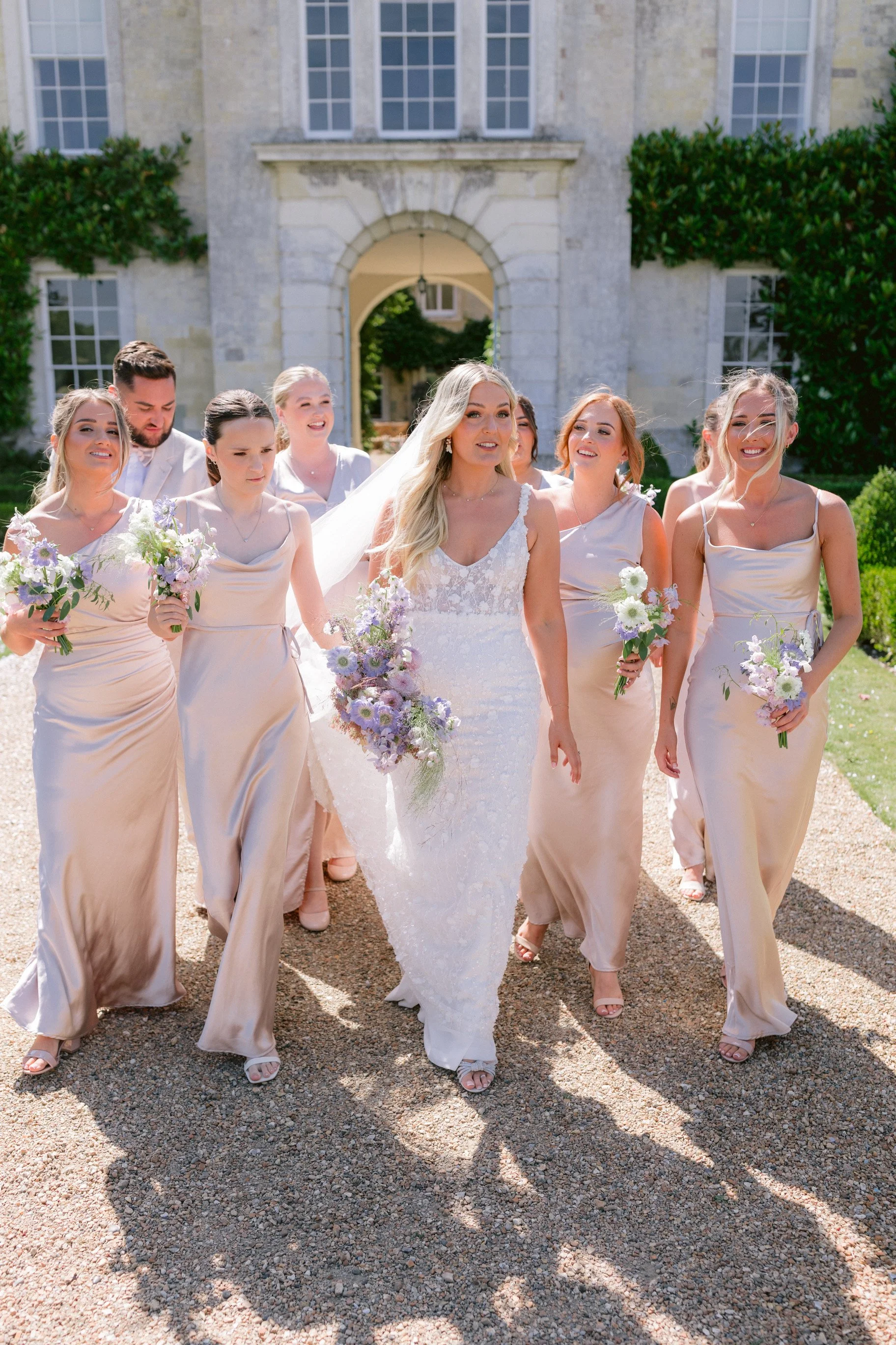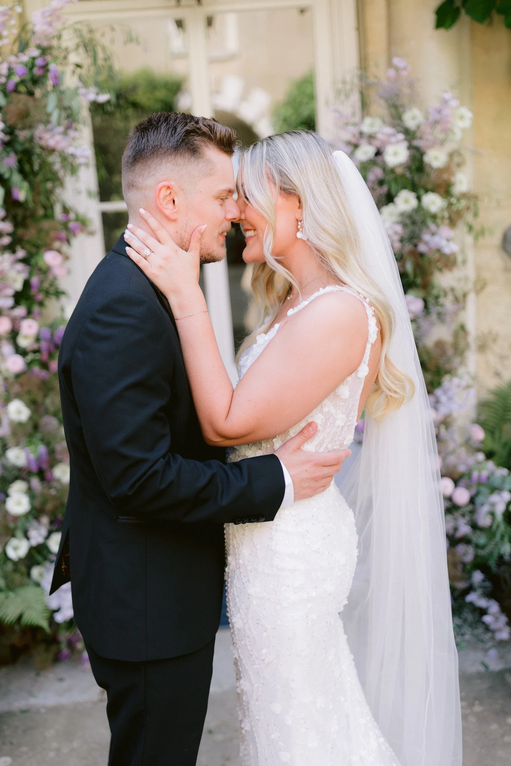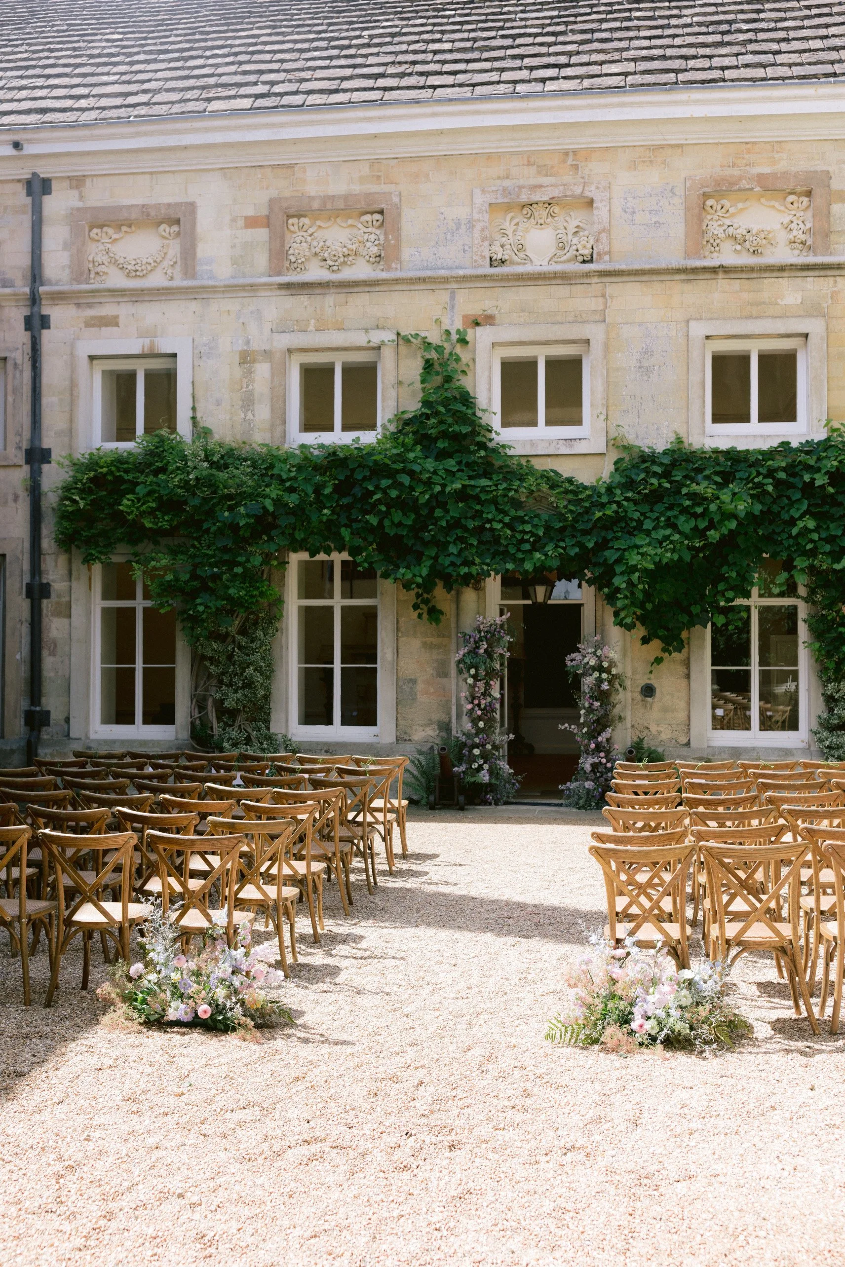 A beautiful August wedding at Firle Place with the most soft and luxurious combination of English florals in shades of lilac, from delphiniums and sweet peas to wildflowers and campanulas. A dramatic arch and floral meadows adorned the courtyard for the ceremony, with bud vases of blooms for the reception. Photography: Ross Hurley