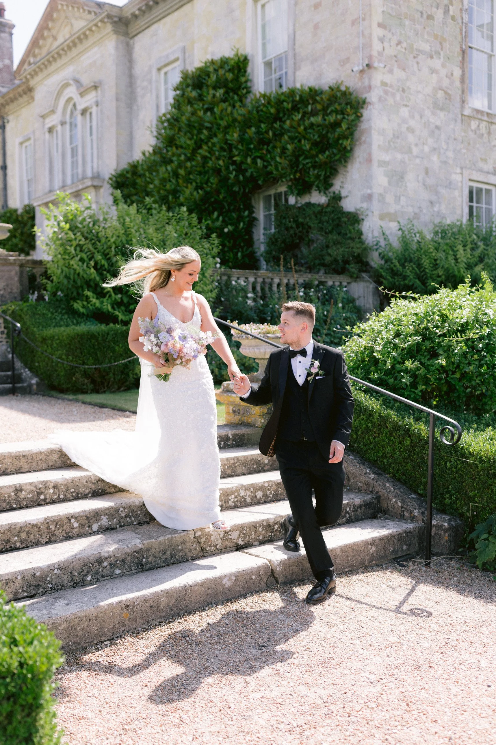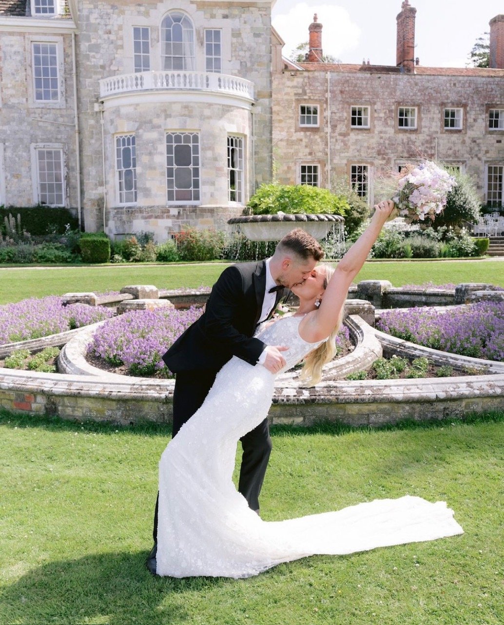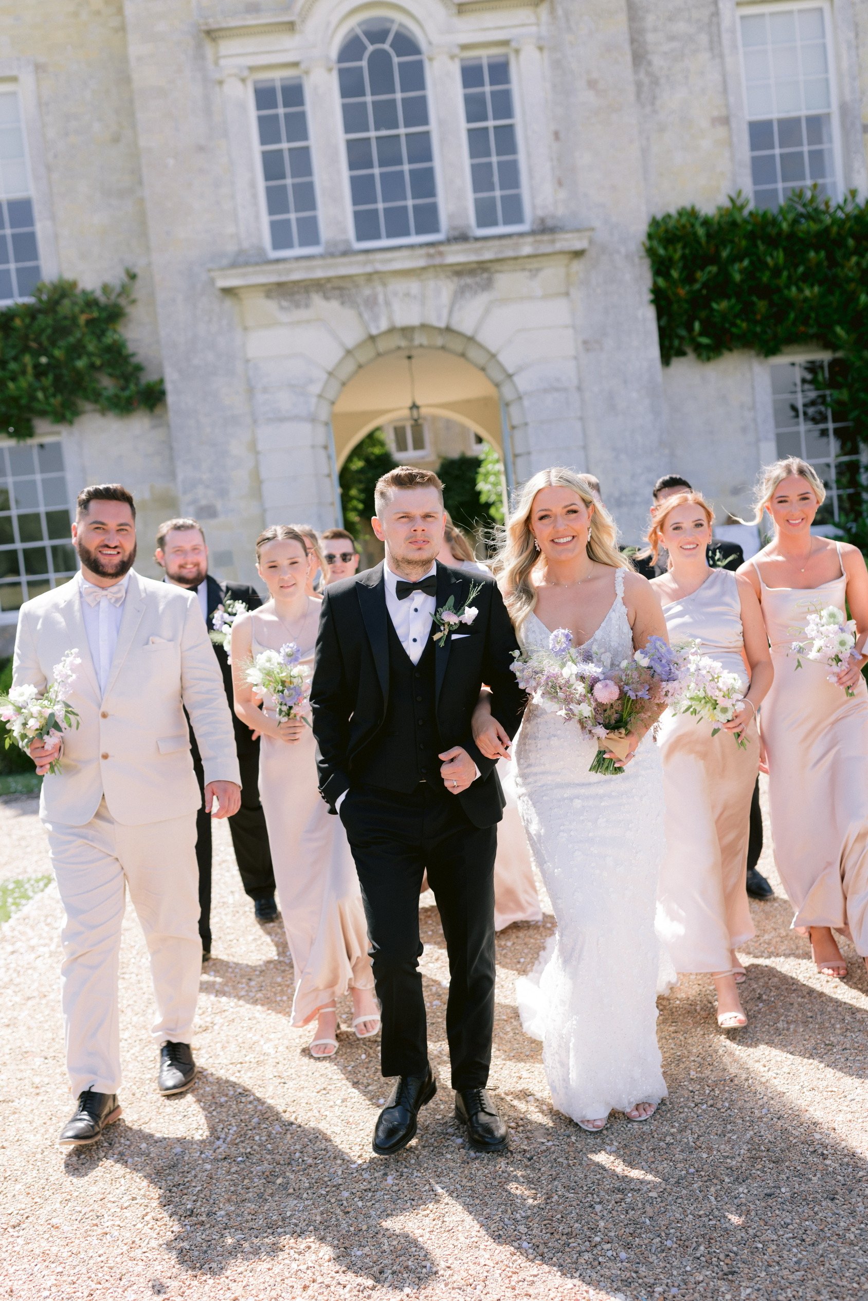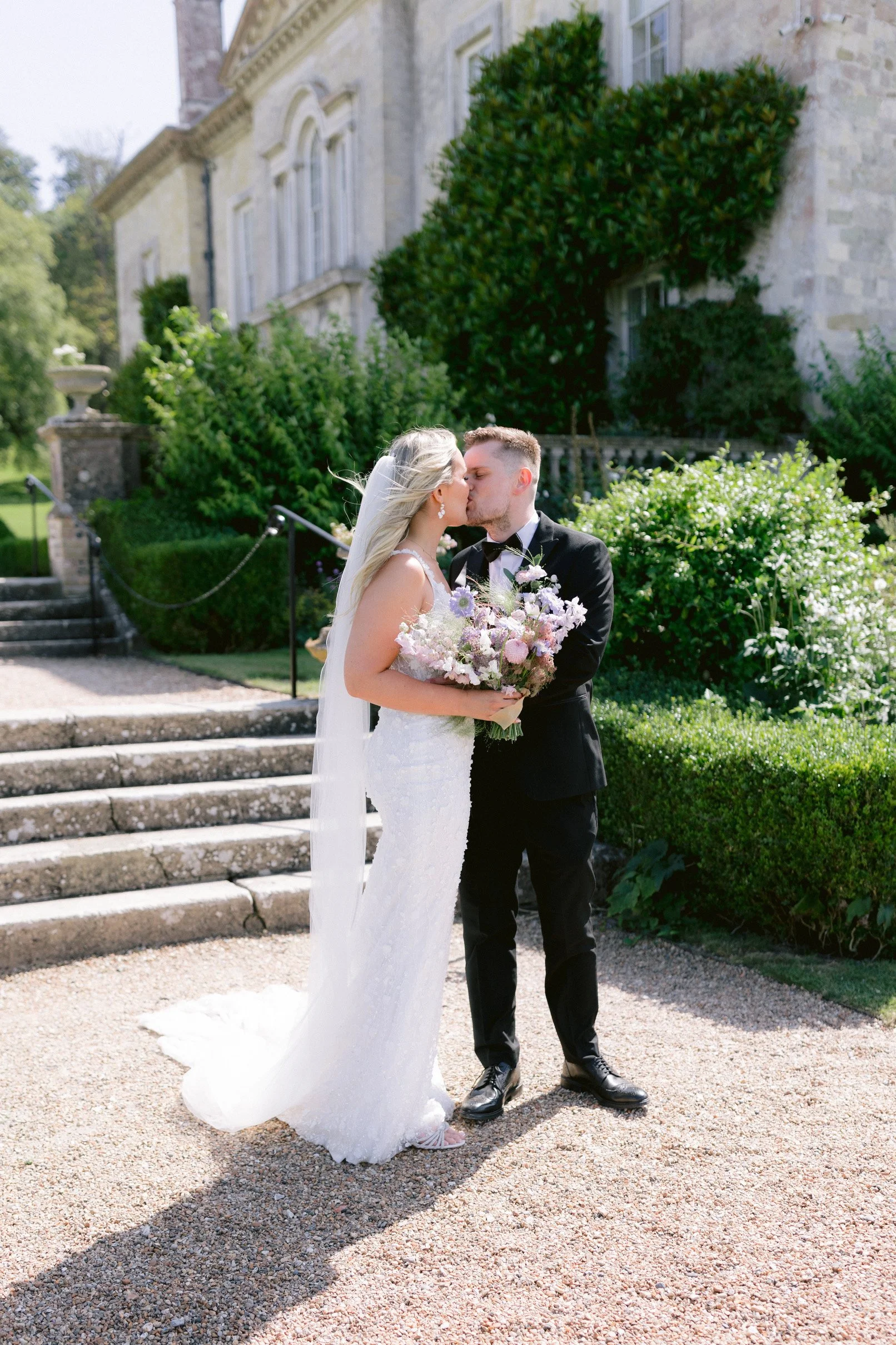 A beautiful August wedding at Firle Place with the most soft and luxurious combination of English florals in shades of lilac, from delphiniums and sweet peas to wildflowers and campanulas. A dramatic arch and floral meadows adorned the courtyard for the ceremony, with bud vases of blooms for the reception. Photography: Ross Hurley